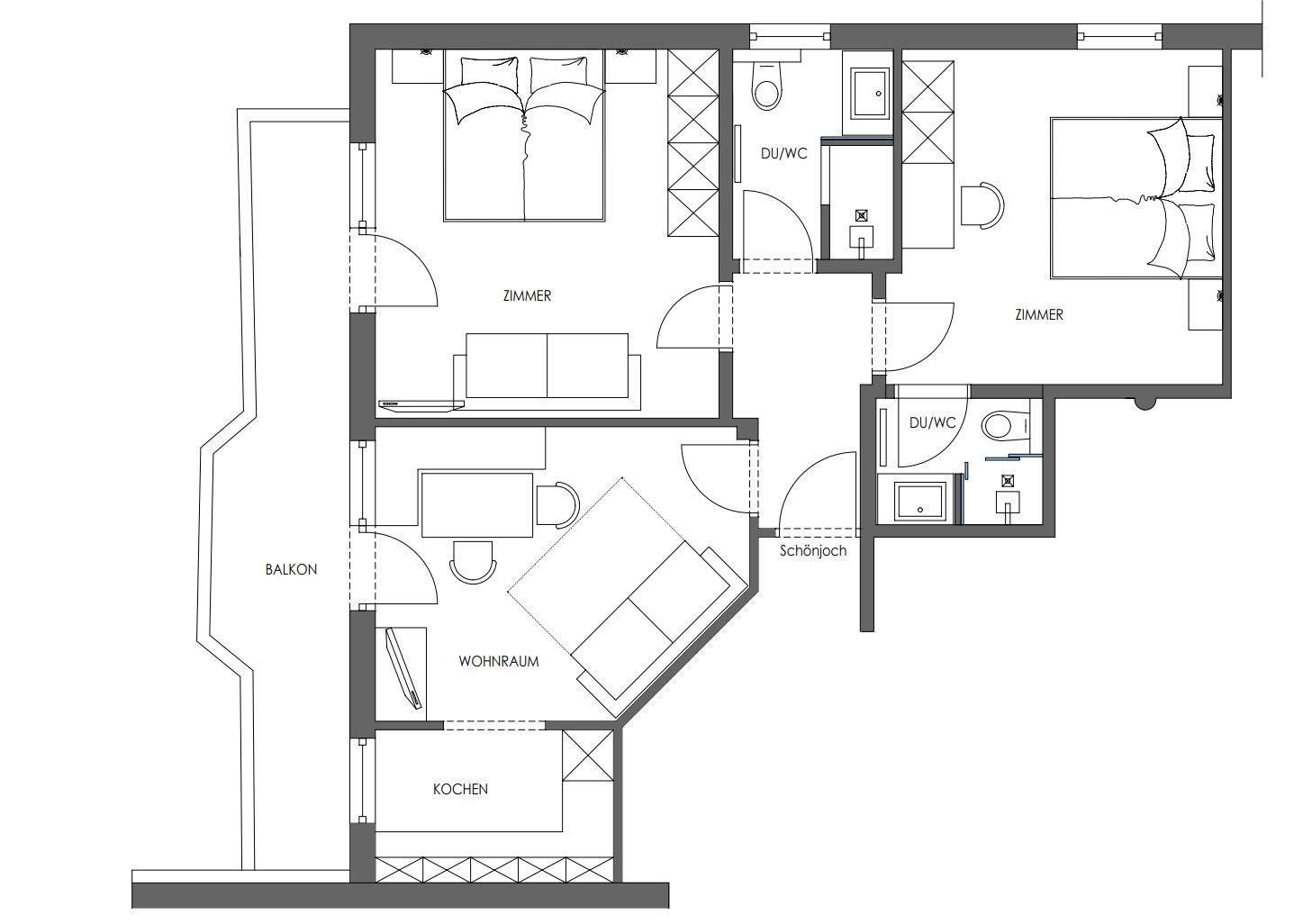 Zwei separate Schlafzimmer, zwei moderne Nasszellen mit Dusche/WC sowie ein großzügiger Wohnraum mit Schlafmöglichkeit und Essecke schaffen Raum für gemeinsame Zeit und Rückzug zugleich.
