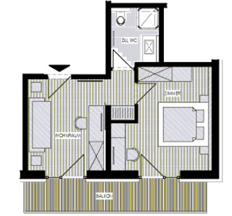 Beide Räume sind liebevoll eingerichtet und mit offenem Sichtdachstuhl gestaltet. Ein Vorraum sowie eine Nasszelle mit Dusche/WC sorgen für Komfort. Zur Ausstattung gehören Sat-TV Flachbildschirm, Minibar, Safe und Föhn.