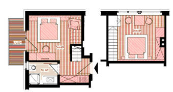 Das Familienzimmer Rosenquarz im Apart Hotel Garni Kofler in Fiss erstreckt sich über zwei Etagen und bietet mit insgesamt 22 + 6 m² ein behagliches Zuhause für 2–4 Personen.